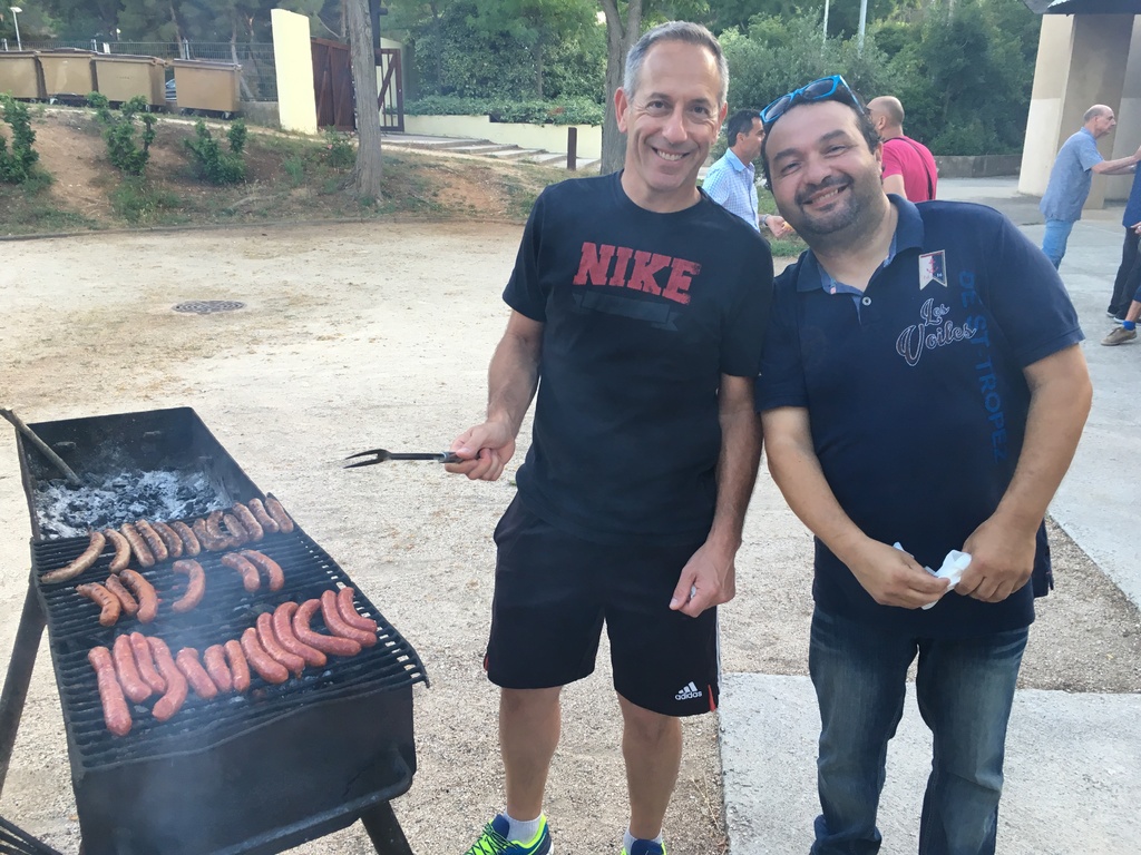 En photo : Fodil et Christophe devant le barbecue: Christophe était de passage, Fodil est bien le maître de la braise !