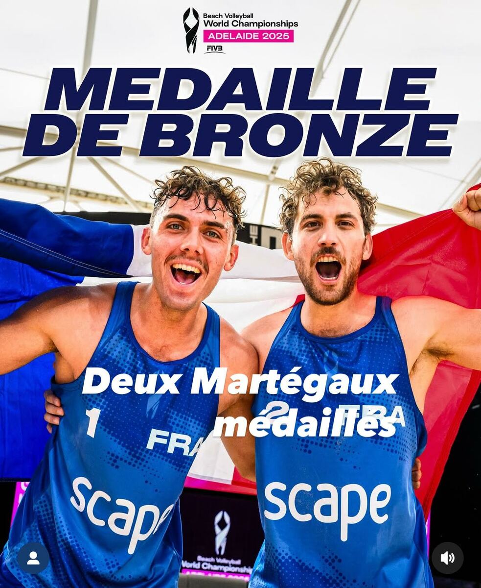 C'est en Australie, très tôt ce dimanche matin. Ce sont deux martégaux Téo et Arnaud qui montent sur le podium du mondial de Beach Volley. Une joie immense pour toute notre communauté, une joie immédiament diffusée sur le facebook du club avec vos premières réactions. Téo Rotar et Arnaud Gauthier-Rat viennent de se hisser jusqu'à la medaille de bronze. Un grand bravo à nos deux représentants. Tricolores et Martégaux. On est très fiers de voir nos couleurs monter sur un podium de championnat du monde.