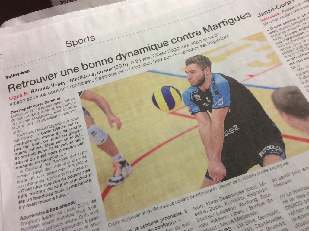 Ouest France consacre aujourd'hui un large article à notre rencontre. Plusieurs informations importantes. Dans ce papier : le retour de Rodney Ah-Kong au centre de l'attaque de Rennes et l'absence du recep-attaq Martti Jukhami. Le quotidien nous apprend que le joueur est absent à cause d'un syndrome de " la main froide" c'est à dire l'absence de sensation au bout des doigts. Un retour pour une absence à Rennes contre un retour à Martigues, celui de Alexandar Mitrovic.