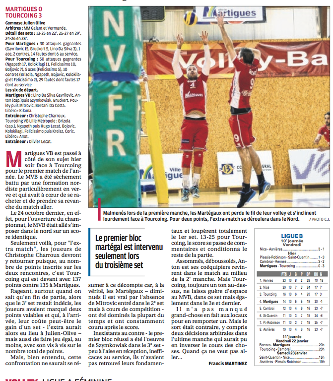 Le grand quotidien régional a suivi notre match face au TLM. Dimanche matin La Provence a titré: '' Le MVB aux abonnés absents''. Selon le quotidien ''les Martégaux ont raté leur match face aux Nordistes''. Francis Martinez auteur de l'article a bien noté que l'extra-match se déroulera finalement dans le Nord : '' Pour deux petits points''. Tous les lendemains de match, retrouvez le compte rendu de la rencontre dans les pages sports de La Provence.
