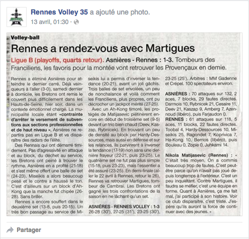 Lu sur le facebook de Rennes Volley : le compte rendu du quart entre Rennes et Asnières. Il y a certainement des enseignements à tirer et des raisons suplementaires d'espérer. Allez Martigues ! Toujours debout !