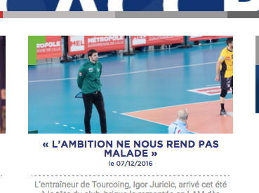 "L’entraîneur de Tourcoing, Igor Juricic, arrivé cet été à la tête du club, brigue la remontée en LAM dès cette saison. Une ambition qu’il ne craint pas d’afficher et qui lui semble au contraire pouvoir agir comme un moteur pour son équipe"