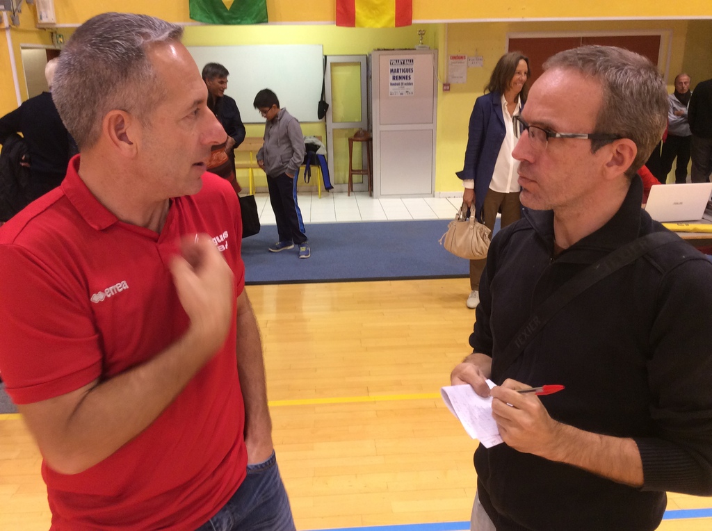 photo. Renaud Blaise en discussion avec notre coach à la fin du match.