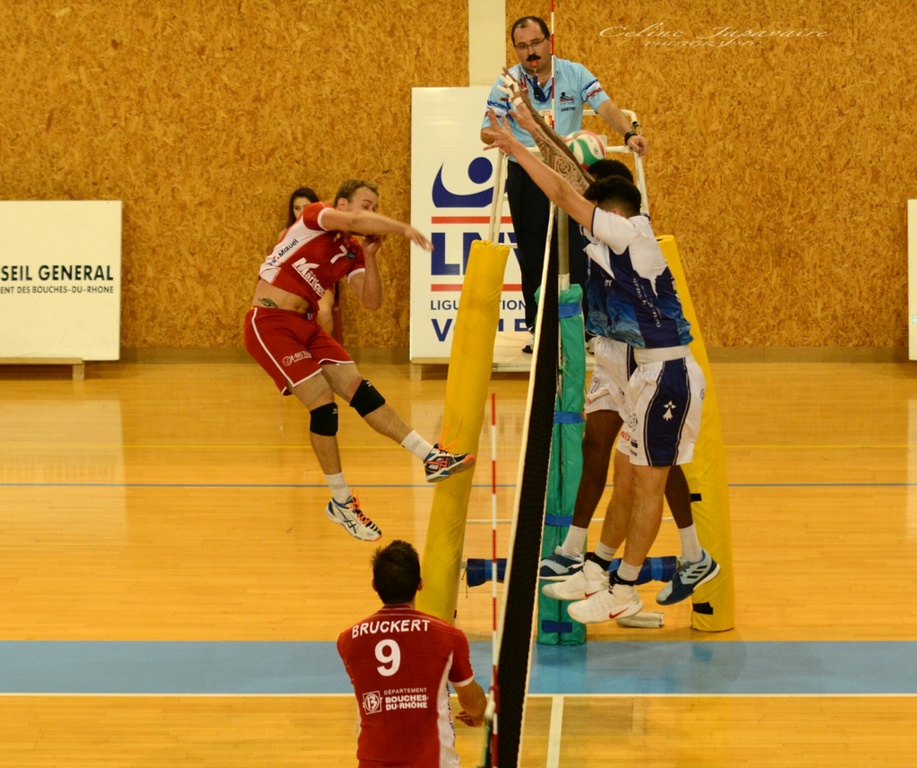 Les très belles photos réalisées pour le club par Céline Japavaire mettent en évidence la détermination de Renaud Ventresque face au block de Saint-Nazaire. Le recep-attaq Martegal est crédité de 16 points sur 27 tentatives ça.est à dire 59 %de réussite. Bravo Renaud.