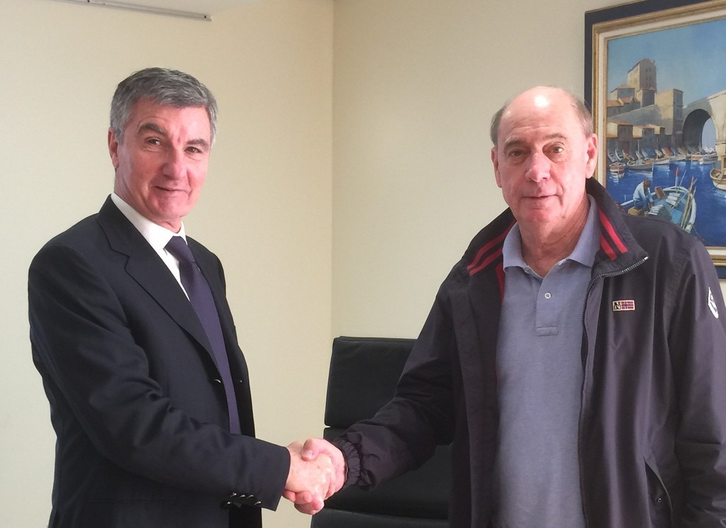 Photo: Lucien Miara président de la fédération du Crédit Mutuel Méditerranéen scèlle le partenariat avec Michel Mellot président du Martigues Volley ball