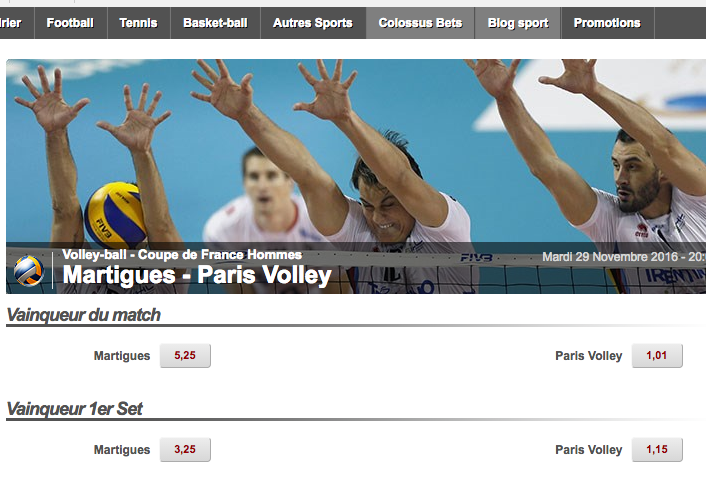 Ce match de Coupe ce soir contre Paris n'est pas une rencontre comme les autres. Le président de la Fédération Francaise de Volley est à Martigues pour assister au choc et on peut aussi parier sur un célèbre site de paris sportifs. On se rend compte que pour ce site la victoire de Martigues aurait la saveur d'une très bonne affaire pour le parieur donc à classer selon ce site dans la catégorie ''exploit''. Par contre, la cote pour ce qui concerne le vainqueur du premier set laisse penser que l'on prêt ''de loin'' une chance à Martigues de remporter la première manche. Comme l'a déclaré William Bersani sur Maritima.Info : Il faudra que paris gagne le amtch '' comprenez : on ne va pas les laisser faire. Allez Martigues ! ça sera dur très dur mais c'est aussi pour cela que le volley est magnifique, pas pour les paris qui entourent le sport pro mais pour la capacité d'une équipe à parfois se sublimer face à la ''montagne''.