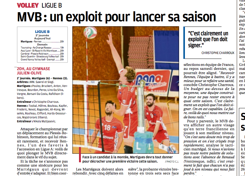 Le quotidien La Provence consacre un bel article à la rencontre de ce soir: ''MVB,un exploit pour lancer sa saison'' titre Eric Stella qui a bien noté que la saison dernière, nos Sang et Or se sont inclinés à cinq reprises sur les cinq confrontations avec Rennes.