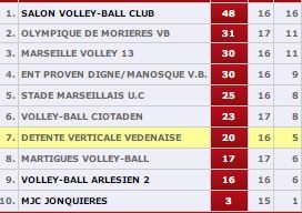 Il nous reste un match à jouer pendant que le VB Arlésien devra en disputer deux et nous n'avons qu'un seul point d'avance sur ces mêmes Arlésiens ... Le moins bon des deux devra descendre !