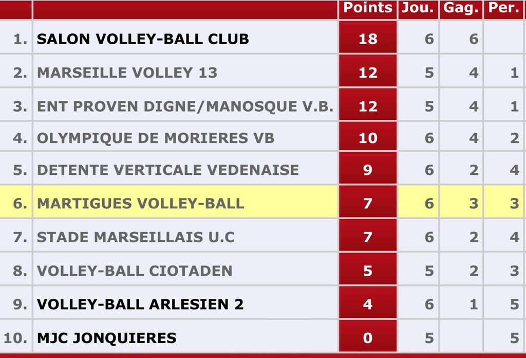 Objectif atteint samedi soir pour l'équipe entraînée par Éric. Victoire en trois sets aux dépens d'Arles, un concurrent direct dans la lutte pour le maintien. Martigues s'impose 25-20, 25-22 et 25-20. Avec cette victoire, Martigues monte à la sixième place du championnat. Prochain match: Le 26 contre Le Volley-Ball Ciotaden ( huitième avec deux points de retard sur nous et un match en moins !).