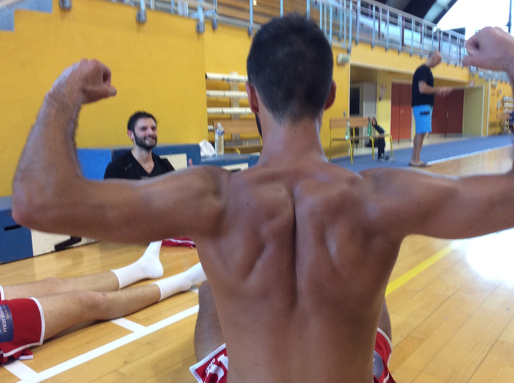Deltoïdes et trapèzes sont déjà bien visibles mais pouvez-vous reconnaître à qui appartient ce dos Sang et Or ? Un indice : C'est un Sang et Or déjà présent la saison dernière qui a pris la pose pour rappeler que le volleyeur pro ne déroge pas à une bonne prépa physique ... Un bon "recep-attaq" dont nous aurons bien besoin dès Octobre dans un championnat très difficile.