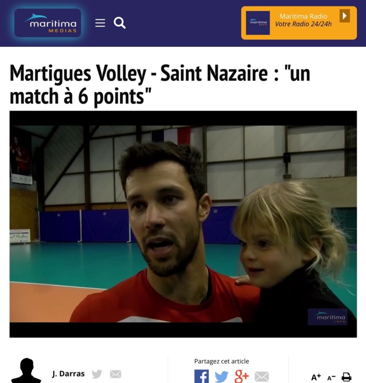 Jean-‘ichel Darras est à fond ! Le reporter de notre partenaire Maritima Medias réalisé une super présentation des enjeux de cette rencontre avec en vidéo Christophe le coach et William notre recep-attaq. Sur le site Maritima.info il écrit « (...) Mais attention le club armoricain voudra tout faire pour enrayer son actuelle perte de vitesse : 3 revers lors de ses 4 derniers matchs dont son dernier à domicile contre Avignon.Le match aller entre St Nazaire et Martigues avait aussi donné lieu à un beau combat. Le MVB avait perdu de justesse 3 sets à 2.(...) ».
