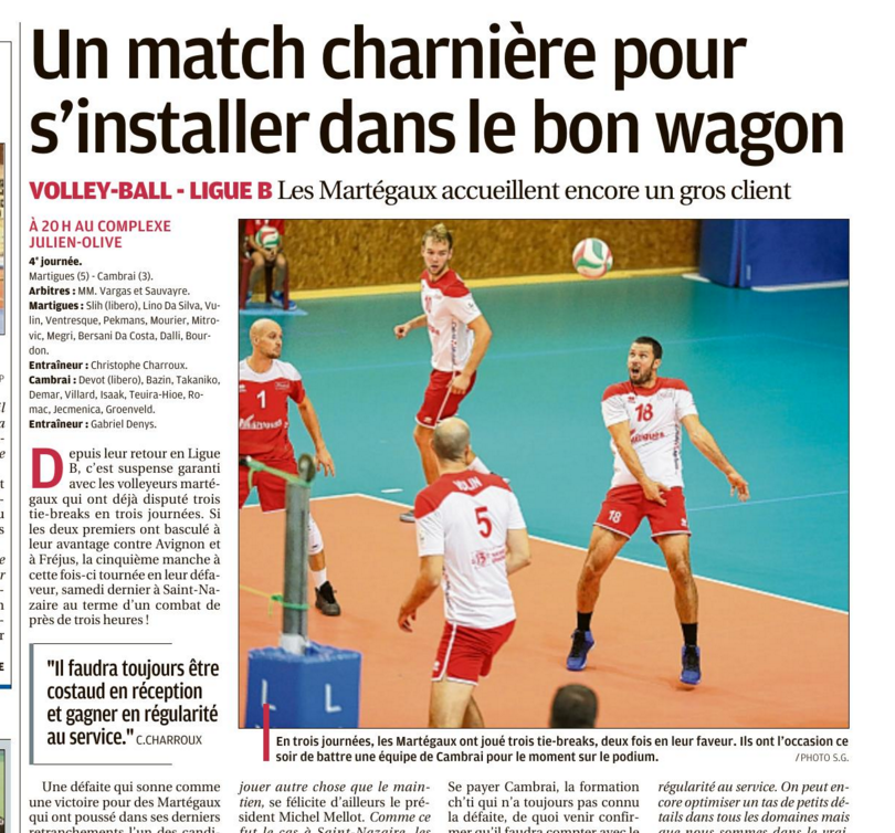 Eric Stella propose un 'gros papier '' dans l'édition Martigues-Istres de La Provence aujourd'hui. L'analyse est pertinente : '' Avec Martigues c'est suspense garanti (...) Si c'est encore un gros morceau qui s'offre à nous, on a la volonté de confirmer ambitionne Christophe Charroux (...)on peut encore optimiser un tas de petits détails dans plusierus domaines (...) " Cambrai est avec Paris et Saint-Nazaire un des trois gros de ce très difficile championnat de Ligue B alors ce soir encore : Allez Martigues !!
