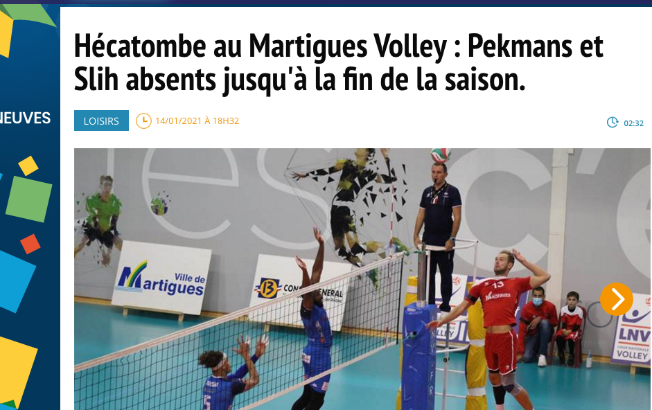 Très mauvais nouvelle pour notre groupe Pro. Après les blessures à répétition en fin d'année, voilà que notre effectif se trouve confronté à deux absences jusqu'à la fin de la saison. Reinis Pekmans notre pointu etait en délicatesse avec son genou depuis plusieurs semaines on le savait, il est maintenant définitivement ''out'' mais l'annonce, dans la semaine, de la blessure longue durée de Jérémy notre libéro est venue compliquer la tâche du président et du coach. Maritima Médias fait un point complet sur son site internet et répond à toutes les questions que vous vous posez :