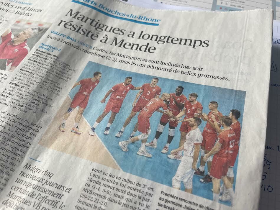 Francis Martinez a suivi derrière un des deux bancs cette première rencontre de la saison, le correspondant du grand quotidien régional aprécie l'engagement de nos Sang et Or. Son article dans l'édition d'hier est très précis : ''Quel combat ! Au terme d'une belle empoignade entre deux équipes très proches, les Martégaux se sont finalement inclinés au tie-breack contre de redoutables Mendoisqui, faut-il le rappeler, ont été des leaders surpuissants de la Ligue B tout au long de la phase régulière, la saison dernière''. et Francis Martinez ajoute '' Malgré cinq nouveaux joueurs et un rajeunissement de l'effectif, le Martigues VB parait déjà bien au point ''. Nous aussi on y croit.