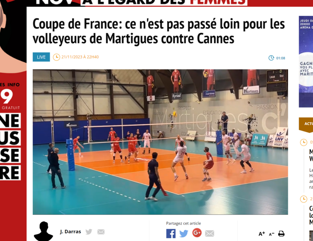 Un bon match de volley entre deux belles équipes, notre partenaire Maritima médias a suivi la rencontre : '' ils ont vraiment donné du fil à retordre aux Azuréens qui les avaient largement dominés en début de mois en ligue B 3/0. Cette fois, les Martégaux ont pris le 1er set 25/20 mais les grands favoris pour la montée en Ligue A ont ensuite fait parler leur puissance pour remporter les 3 sets suivants 19/25, 18/25 et 20/25. Le coach Christophe Charroux, qui avait décidé de préserver son pointu Faipule Kolokilagi, a fait beaucoup tourner donnant du temps de jeu au passeur Matthieu Mouezi, au central Antonin Rouleau et surtout à Dany Poda qui a joué tout le match d'abord en pointe puis en recep/attaq.'' En fin de match Jean-Michel Darras a interviewé Danny Poda. Cliquez sur ce lien pour voir l'interview de Danny Poda