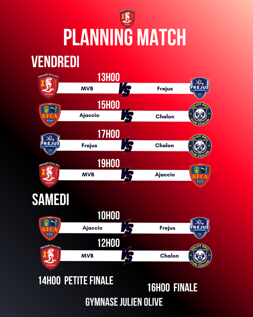 Le Martigues Volley-Ball organise ce week-end le Tournoi de la Méditerranée au Gymnase Julien Olive, les vendredi 10 et samedi 11 octobre. Quatre équipes seront présentes pour offrir un beau spectacle : le MVB, le GFCA Ajaccio, le Volley-Ball Club de Chalon et Fréjus Var Volley. La compétition débutera vendredi à 13h avec un premier match entre Martigues et Fréjus avant d’enchaîner tout au long de la journée avec Ajaccio contre Chalon à 15h, Fréjus contre Chalon à 17h et enfin un choc entre Martigues et Ajaccio à 19h. Samedi matin, Ajaccio affrontera Fréjus à 10h et Martigues rencontrera Chalon à 12h. L’après-midi sera consacrée aux phases finales, avec la petite finale prévue à 14h et la grande finale à 16h. Ce tournoi amical mais compétitif sera l’occasion parfaite de soutenir nos Avatiques et de découvrir l’équipe en action avant le début de la saison. Nous vous attendons nombreux pour venir vibrer avec nous et partager un grand moment de volley à Martigues !